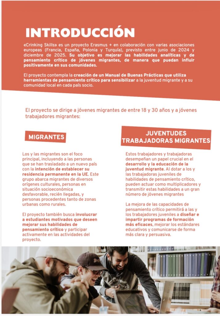 Este manual ha sido desarrollado de forma colaborativa por organizaciones socias de Francia, España, Polonia y Turquía, combinando su experiencia en educación no formal, trabajo con jóvenes, inclusión social y alfabetización mediática. Su objetivo principal es ofrecer herramientas prácticas y metodologías para reforzar el pensamiento crítico tanto en jóvenes migrantes como en los profesionales que trabajan con ellos.